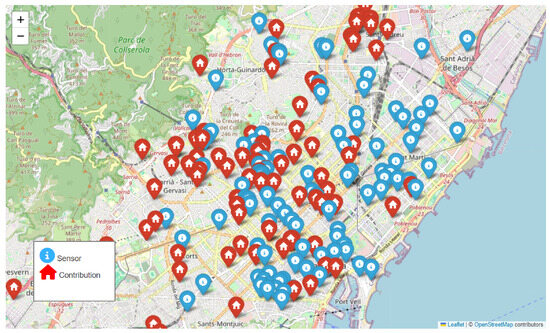 A significant part of the 2021 Sons al Balcó contributions were collected in Barcelona (80), which has a sound sensor network deployed. The Barcelona noise monitoring network [20] was initially deployed in 2017 with 60 sound sensors. However, it has been modified through the years. In fact, some of the sensors that were initially installed have already been removed, and many more have been added. During the first semester of 2021, a total of 117 CESVA TA120 Class 1 sound sensors were operating in Barcelona. Most of them were located in spots with clearly defined predominant noise sources, e.g., road traffic noise or leisure activities. More information regarding the exact specifications and placement of the sound sensors is explained in [21].