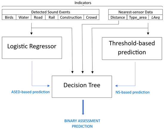 Next, the ASED-based prediction that was developed in a previous work by the authors [14] is added (corresponding to the logistic regressor in Figure 4). Finally, a decision tree (DT) is implemented. This DT uses as inputs the type of sounds detected by the ASED algorithm, the distance between the sensor and the studied soundscape and the type of area where the sensor is circumscribed to choose one of both predictions, i.e., the ASED-based prediction or the nearest-sensor-based (NS-based) prediction, according to the expected reliability of each one (decision tree block in Figure 4).