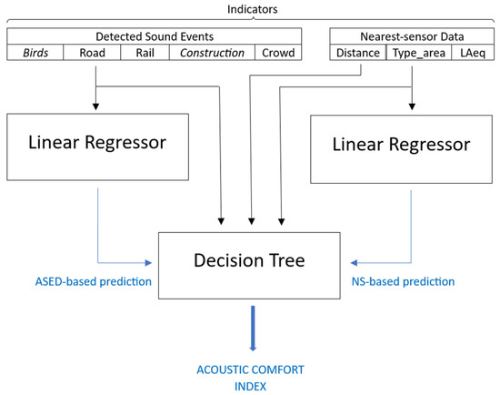 Two different approaches were implemented in order to integrate the ASED-based predictions and the NS-based predictions in the 5-point scale acoustic comfort index estimator. The first approach consisted of averaging both original predictions to give the final ACI figure. For the second approach, a decision tree was used to choose between both estimations, as seen in Figure 5.