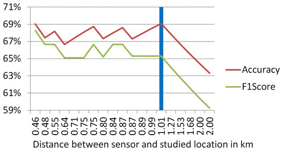 In Figure 6, accuracy and F1-Score were computed, including only those instances compliant with a given soundscape-sensor distance. Grounded on the previous work [24], which confirmed the alignment between sensor data and subjective perception of the soundscapes in dwellings up to 1 km distant, a grid-search for accepted distances was performed from just under 500 m to 2 km. For the first km, the accuracy fluctuates between 67% and 69%, and F1-Score also fluctuates between 65% and 68%. These oscillations are mostly caused by the limited size of the dataset. At approximately 1 km, the fluctuations stop, and both metrics start to fall steadily with distance. Accuracy drops to just over 63% and F1-Score descends to just over 59%. These drops are especially significant taking into account that there are very few soundscapes located farther than 1 km from their nearest sensors. Consequently, 1.01 km is the maximum permitted distance for this present study. From the 60 soundscape candidates, 55 are included in the accepted 1.01 km range.