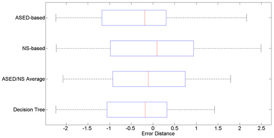 Averaging both predictions partially corrects the bias and offers error distances with only a slight increase compared with the ASED-based scenario. Both the second and third quartiles are within the ±1 error distance range. Moreover, the first and fourth quartiles are approximately within the ±2 error distance range. The RMSPE error for this approach is 0.42% lower than the error made by the ASED-based design (see Table 5). In spite of this, MAPE error is higher (0.89) than in the baseline predictor (0.85). Finally, the combined method based on a decision tree is the approach that achieves better results according to the different error metrics. The RMSPE is almost the same as in the averaged predictor. Furthermore, the MAPE error decreases to 0.835, which is a 1.14% improvement compared to the ASED-based estimator. It should be noted, though, that the decision tree design retains the original bias of the ASED-based predictor because, in general, it favors ASED-based estimations over NS-based estimations (as is logical given the original performance of them).