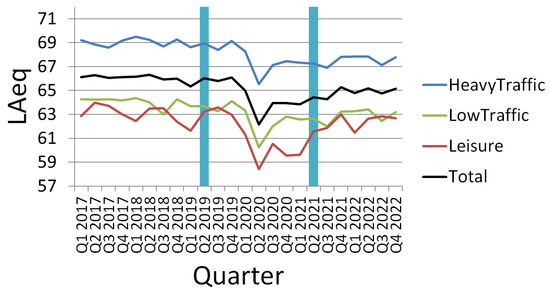 In Figure 8, the evolution of the quarterly mean level for the sensors that were continuously working from 2017 to 2022 is depicted. The graph shows not only the noise levels for the aggregated set of sensors (in black) but also the quarterly mean levels for the subsets of sensors located in different kinds of areas, i.e., heavy-traffic, low-traffic and leisure. The few sensors located in parks were not yet operative in 2017 and thus were not included in the Figure. Vertical bars mark the quarters from where levels for the present study were obtained. It can be observed that levels before the lockdown (first quarter of 2020) were stable (even though sensors located in leisure areas experience a seasonal variation with periodic drops during the winter months). In 2020, all noise levels experienced a steep decrease caused by the restrictions imposed during the COVID-19 lockdown [21]. From 2021 on, noise levels have been slowly growing again but, as seen in Figure 8, they have not yet reached the original pre-pandemic scenario. That is especially true for the first semester of 2021, where noise levels are considerably lower than those registered from 2017 to 2019. Therefore, for citizens inhabiting the same dwelling for a long time, pre-lockdown data could better represent their perception on soundscape’s quality than noise levels obtained during the 2021 Sons al Balcó campaign.