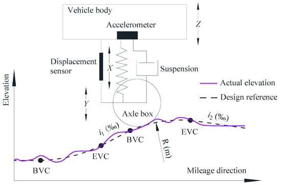 Figure 1 presents a schematic diagram of a VC and TGCs based on an IMS. A VC with a radius R (m) connects two different gradients, i1‰ and i2‰, between the beginning point (BVC) and the ending point (EVC), facilitating uphill and downhill transitions. The VC at the top of the hill is termed a summit curve, while the VC at the bottom of a hill is termed a sag curve. Currently, TGCs are predominantly conducted using IMSs, which utilize inertial measurements and digital filtering to output the LL based on changes in vertical acceleration [,,]: refer to Figure 1 for details. The LL irregularities Y of a track are determined using the formula presented below.