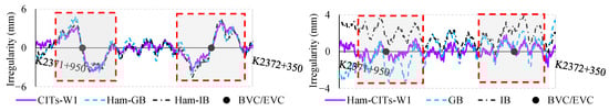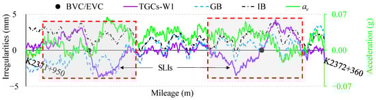 Figure 2 reveals that the relative relationships of the track’s vertical deviation waveforms from the two TSI modalities are fundamentally aligned. However, significant disparities are observed in the output between TGCs and TSTs around the BVC/EVC, where TGCs-W1 undergoes severe deformation, resembling large S-shaped long-wave irregularities (SLIs). Additionally, the vertical acceleration of the vehicle body in this section also increases significantly. In other sections, however, similar discrepancies are not found.
