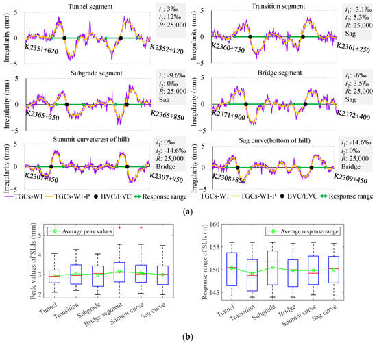 Track vertical irregularities derived from different wavebands: (a) examples of S-shaped irregularities in different wavebands; (b) peak values and response range of SLIs according to different wavebands using box-plots.