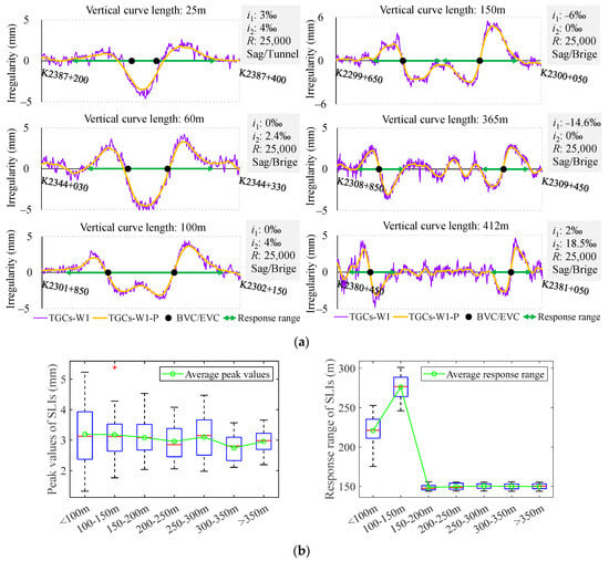 SLIs with VC lengths ranging from 25 m to 412 m: (a) examples of SLIs with different VC lengths; (b) peak values and response range of SLIs according to different VC lengths using box-plots.
