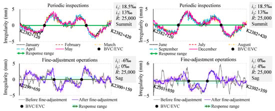 The aforementioned investigations have focused on SLIs collected at different mileage locations within a single batch. Moving forward, this study will further consider conducting a comparative analysis of periodic inspections, including interventions for track fine-adjustment operations. After collecting and organizing nearly a year’s worth of output data from monthly TGCs, the SLIs were aligned based on mileage and superimposed, as depicted in the first two images of Figure 5. Notably, distinct SLIs are present in the waveforms around the BVC/EVC points for each month. Moreover, the waveforms are in accordance with each other, with variations of less than 1 mm. As depicted in the last two images of Figure 5, track fine-adjustment operations evidently did not mitigate the SLIs. This further indicates no discernible correlation between the SLIs and the times of inspections or the implementation of fine-adjustment operations.