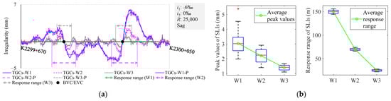 To eliminate the effects of measurement errors and ultra-short-wavelength irregularities of the track, a filtering pre-processing step is applied to the vertical irregularities output by the TGCs, which are denoted as TGCs-W1-P, TGCs-W2-P, and TGCs-W3-P in the following figures. Subsequently, VCs are to be classified according to the subgrade foundations (in Figure 3), their positions (in Figure 3), lengths (in Figure 4), the times of inspections (in Figure 5), and the fine-adjustment operations (in Figure 5). This classification will facilitate an analysis of the SLIs’ peak values and response ranges, where the peak value is defined as the amplitude from zero to the peak value. The response range is identified based on the beginning and ending points of waveform deformation and is indicated with double arrows on the chart. In consideration of the difference in track loading exerted by TGCs and TSTs, conducting an initial investigation on whether the SLIs are correlated with the types of subgrade foundations is pertinent, as shown in Figure 3.