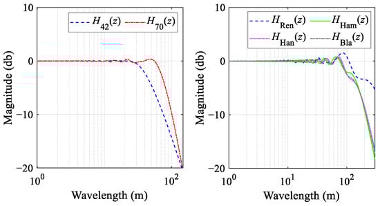 In the forthcoming section, we introduce a duality of methodologies dedicated to the development of a filter model with a cutoff wavelength of 150 m for simulating IMSs. The initial approach entails a systematic adjustment of the window length and the coefficients of the associated window function, guided by the principles underpinning the H70(z) system function. This iterative process continues until the amplitude–frequency characteristics and the cutoff wavelength of the filter are in strict accordance with the predefined specifications. Through a series of optimization simulations, involving a meticulous tuning process, a filter system function model, denoted as HRen(z), is derived. This function encapsulates the desired properties essential for an accurate simulation of an IMS. The filter system function model HRen(z) is presented in Equation (4), and its amplitude–frequency characteristics are presented in the right panel of Figure 7.