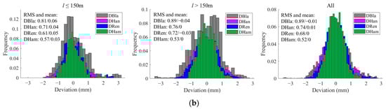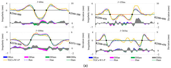 In the following section, we critically evaluate the accuracy and feasibility of the four previously delineated simulation models through multiple dimensions. The initial validation approach employs the longitudinal profiles of the GSG HSR design as an input sequence to simulate the inertial measurement process. Specifically, this input sequence is sequentially fed into HRen(z), HHan(z), HHam(z), and HBla(z) for corresponding processing. Subsequently, the simulated outputs are compared with those of TGCs-W1-P. To achieve a validation that is both robust and persuasive, deliberating on the selection of VC sections with varying radii (R); lengths (l); and locations, such as sag or summit curves, is essential. As presented in Figure 8, Ren, Han, Ham, and Bla, respectively, represent the track vertical irregularities simulated by HRen(z), HHan(z), HHam(z), and HBla(z). Concurrently, DRen, DHan, DHam, and DBla represent the deviation values for these simulated outcomes and TGCs-W1-P. Figure 8a presents a comparison and deviation examples between simulated and actual waveforms for different VC lengths. Figure 8b offers a frequency histogram of deviations based on the length of the VCs, divided into segments for VCs of l ≤ 150 m, VCs of l > 150 m, and all VCs, along with the root-mean-square (RMS) and mean values for the four model deviations, all labeled on the histogram.