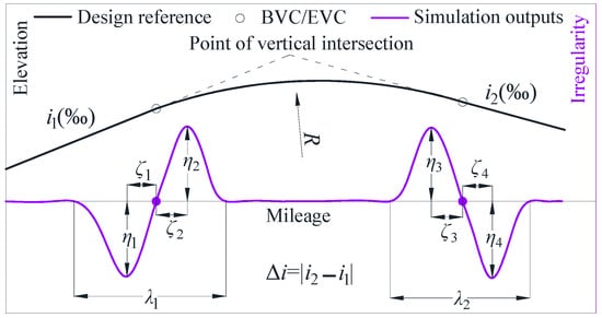 Merely qualitative discussions are clearly insufficient to meet practical requirements. Routine maintenance is much more interested in quantitative analyses of TIs. Therefore, referring to the maintenance rules in [], here, we use a maximum gradient for the HSR of 30‰ and a minimum radius for the VC of 15,000 m. Taking the VC radius R (m) and the gradient difference Δi (‰) between adjacent slopes as variables, four sets of longitudinal profiles (Groups A to D) have been combined with the parameters listed in Table 1.