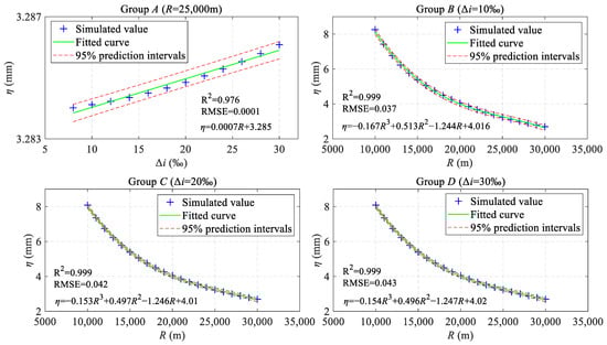As shown in Figure 11, a linear correlation exists between the peak value η and the gradient difference Δi in Group A. The coefficient of determination (R2) is 0.976, and the root-mean-square error (RMSE) is 0.0001. The specific regression equation is annotated on the figure for reference (the same applies to subsequent figures). This correlation indicates that when the radius R is fixed and the gradient difference Δi is gradually increased from 8‰ to 30‰, the linear functional relationship between η and Δi is significant. Nonetheless, the fluctuation In η is confined with a narrow range, approximately 3.284 ± 2.8 × 10−4 mm at a 95% confidence level. This finding suggests that the peak value of SLIs is marginally influenced by the gradient difference. For Groups B to D, guided by the R2 and RMSE, cubic polynomials were adopted for fitting (R was centered to zero and scaled to a unit of standard deviation). Evidently, the peak value η decreases as the radius R increases. Specifically, when R increases from 10,000 m to 20,000 m, η decreases significantly, dropping from 8.254 mm, 8.085 mm, and 8.084 mm, respectively, to 4.042 mm. In contrast, when R increases from 20,000 m to 30,000 m, the decrease in η tends to level off, from approximately 4.042 mm to 2.695 mm. Upon comprehensive analysis, the peak values of SLIs can be inferred to be significantly influenced by the radius of the VC, particularly when the radius is less than 20,000 m.