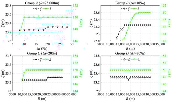 As shown in Figure 12, for Group B, where R is less than 17,000 m, the value of ζ varies in accordance with the increase in R. In other instances, ζ is essentially fixed at around 23.3 m. This demonstrates a stable and predictable pattern in the waveform’s peak location of SLIs. Considering the discernibility of the peak points, this facilitates the convenient establishment of a correlation between the inspection waveform and the corresponding onsite location. Regarding the response range λ, in Group A, where Δi is less than 10‰, λ exhibits a rapid increase with the expansion of Δi. This trend is mirrored in Group B and C, where R is less than 23,000 m and 12,000 m. However, when Δi or R deviates from the aforementioned range, the value of λ remains essentially invariant at 150 m, corresponding to the cutoff wavelength of W1. Additional research demonstrates that Δi in Group A or R in Groups B and C taking small values can lead to the length of the VC being less than 150 m, and the S-shaped waves at the BEVC may superpose on each other. This leads to changes in ζ (less than 23.3 m) and λ (less than 150 m). In contrast, once the length of the VC exceeds 150 m, the S-shaped wave returns to its pristine form, with its response range fixed at 150 m. Indeed, as previously analyzed, the response range of the S-shaped wave is influenced by the cutoff wavelength of the IMS.