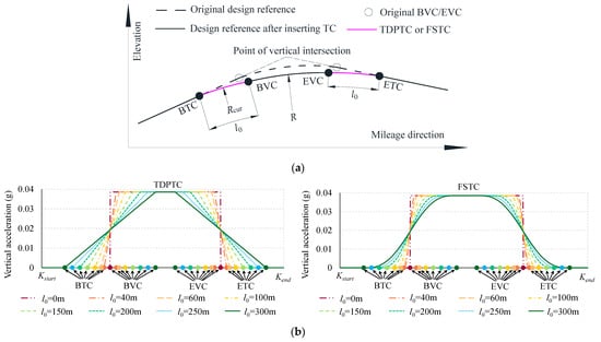 where R is the radius of the VC, and l0 is the length of the TC. As shown in Figure 13a, following the increasing mileage, the design reference sequentially passes through the beginnings of the transition curve (BTC) and vertical curve (BVC), the end of the vertical curve (EVC), and the transition curve (ETC). The variations in the vertical acceleration av of the vehicle body, with l0 ranging from 0 to 300 m, are simulated using the point mass acceleration (PMA) method []. The acceleration is calculated using the following equation: