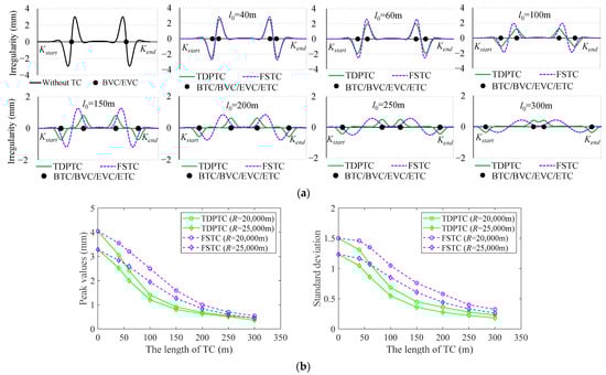 Referring to the code for the design of an HSR [], the minimum radius of the VC is 20,000 m, 25,000 m, and 25,000 m for design speeds of 250 km/h, 300 km/h, and 350 km/h, respectively. For these two radii, consideration is given to adding TDPTCs and FSTCs at the BEVC, with l0 ranging from 0 to 300 m. After adding two types of TCs, the simulation comparison of the SLIs, as well as the changes in the peak values and standard deviation (SD) of the SLIs, is shown in Figure 14.