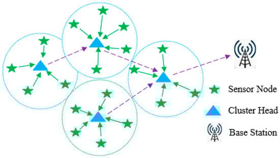 Wireless sensor networks (WSNs) are networks composed of several nodes strategically deployed in the environment, where sensors are tasked with sensing and transmitting information to the sinks and base stations. However, these sensors have limited battery power and are very difficult to recharge following deployment []. Therefore, the present study’s objective was to reduce the energy exhaustion of sensors and thereby extend the overall lifetime of the sensor network. To minimize network energy consumption, nodes are grouped into clusters [], with each cluster containing a designated cluster head collecting and aggregating information from its members. Subsequently, the cluster head forwards the collected information to the sink using either a single- or multi-hop approach. The selection of cluster heads is a challenging task, and various techniques have been employed to achieve an optimal selection of cluster heads [,].