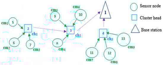Because the direct transmittance of data to the base station demands higher energy expenditure from the cluster heads, clustered sensor networks require a routing protocol that prioritizes minimizing energy consumption while selecting the optimal path from the clusters to the base station []. However, the construction of a clustering-based routing algorithm with high energy efficiency and increased packet transmission rate for large-scale sensor networks is an NP-hard problem []. In other words, the process of selecting optimal cluster heads and establishing efficient routing paths for large-scale sensor networks entails high time complexity. This issue can be efficiently solved by metaheuristic algorithms [,] and swarm intelligence [,].