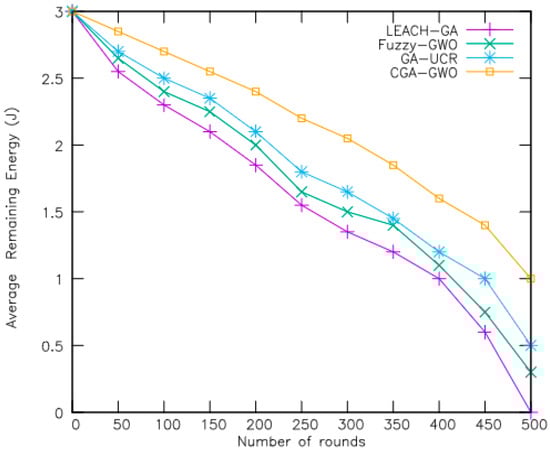 Figure 6 presents a plot of average remaining energy in a 200-node network over an increasing number of rounds. Here, CGA-GWO showed approximately 17%, 22%, and 30% more residual energy than GA-UCR, fuzzy-GWO, and LEACH-GA, respectively, by selecting nodes with the highest fitness values as cluster heads. The network can sustain operation for up to 700 rounds when the average remaining energy of the proposed algorithm CGA-GWO reaches 1 J by the 500th round. Specifically, the proposed algorithm determines suitable nodes for every generation of the population for energy-efficient routing. In addition, CGA-GWO selects chromosomes that consume less energy—i.e., have the maximum residual energy. These chromosomes are associated with the highest fitness values, establishing a direct proportionality between the fitness function and residual energy. Thus, the selection of cluster heads is facilitated by a chaotic genetic algorithm that relies on the residual energy of nodes in the network. This approach enhances the efficiency of cluster head selection and contributes to the overall energy optimization in the network.