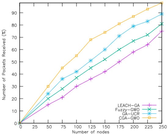 Figure 7 shows the percentage of packets received by considering the total number of nodes in the network. For each algorithm, the percentage of packets received increased along with the number of nodes. Nonetheless, CGA-GWO outperformed LEACH-GA, fuzzy-GWO, and GA-UCR by 38%, 27%, and 14%, respectively, in terms of the percentage of packets received. The proposed CGA-GWO algorithm achieves a packet reception rate of 63%, which surpasses that of other related schemes. These results can be attributed to the fact that the GA-UCR algorithm neglects the existence of energy holes or hotspots formed during the routing process. In contrast, CGA-GWO maintains an increased number of delivered packets owing to its fitness function, which effectively minimizes packet loss during data transmission. To further reduce packet loss, CGA-GWO constructs an efficient path that does not contain dead nodes. Conversely, LEACH-GA and fuzzy GWO have high packet drop ratios stemming from inappropriate cluster head selection.
