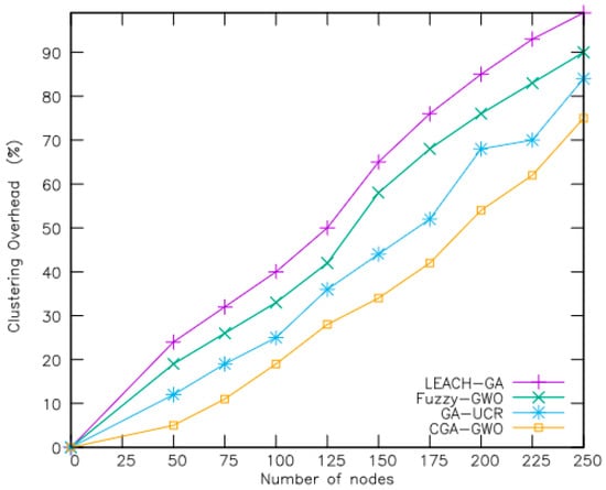 In Figure 8, the clustering overhead of the CGA-GWO is compared with that of the three baselines by varying the number of nodes. CGA-GWO exhibited overhead reductions of 41%, 34%, and 11% compared with LEACH-GA, Fuzzy-GWO, and GA-UCR, respectively, as the proposed clustering fitness function selects high-residual energy nodes as cluster heads. Furthermore, the incorporation of chaotic features reduces the involvement of heavily loaded sensor nodes in the clustering process. In addition, the CGA-GWO algorithm employs an elitist selection method to select high-quality chromosomes, ensuring the transmission of elite individuals to subsequent generations. This ensures that higher-quality genes participate in each successive generation’s clustering process. In contrast, fuzzy GWO incurs a higher clustering overhead owing to repeated transmissions, whereas GA-UCR uses an intercluster separation fitness function to select cluster heads, resulting in increased overhead owing to the sizes of clusters. Ultimately, CGA-GWO employs a chaotic genetic algorithm to identify suitable cluster heads, minimizing the overhead associated with the clustering process.