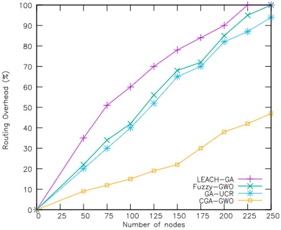 In Figure 9, the routing overheads of the different schemes are plotted for varying numbers of nodes, with CGA-GWO exhibiting a 47% reduction in overhead compared with the baselines. This is attributed to the consideration of factors such as the number of hops per path and residual energy per hop when selecting a routing path. By considering these factors, the fitness function facilitates the identification of an efficient route to the base station. The optimization aims to reduce the hop count along the path, resulting in a more efficient routing path compared with that determined by the baselines. In addition, the wolves’ arrangement and directional movements play crucial roles in determining the optimal routing solution. In GA-UCR, the classic genetic algorithm is employed to navigate data toward the base station given the NP-hard nature of the problem. In fuzzy GWO, nodes along the routing path remove the corresponding packets from their queues, leading to increased packet retransmissions and, consequently, a higher routing overhead.