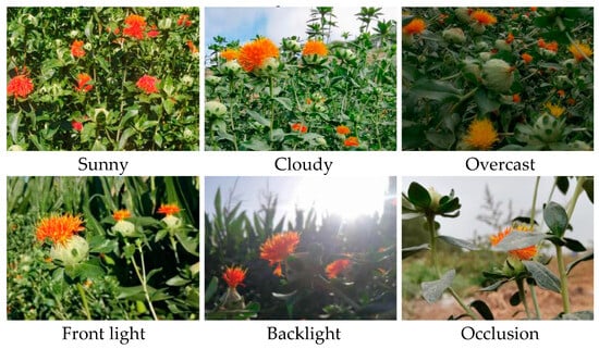 The safflower filament image acquisition device utilized the Orbbec Gemini 2L camera (Orbbec, Shenzhen, China), featuring a resolution of 1280 × 720 pixels. Images were collected from 7 July to 16 July 2023, during the safflower filament harvesting period, when the height of the safflower plants, as well as the distribution and number of flowers and fruits, were stable. To ensure the diversity of the collected image data, images were taken from multiple angles under three different weather conditions (sunny, cloudy, overcast), two different lighting conditions (front light, backlight), and both obstructed and unobstructed scenes, as depicted in
