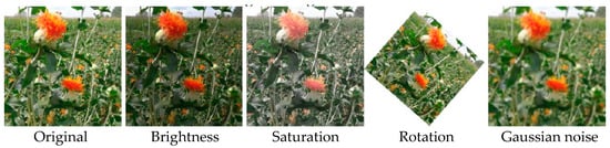 The collected dataset of safflower filament images does not comprehensively cover the variable factors present in unstructured environments. To augment the training set and improve the detection and generalization capabilities of the recognition model, data augmentation strategies such as random brightness, random saturation, random rotation, and random Gaussian noise were applied to the original image data using Python. These techniques aim to encompass as many unstructured environment images as possible. Adjustments in brightness and saturation primarily mimic changes in light intensity due to weather variations encountered during actual recognition, while random rotation and Gaussian blur simulate scenarios caused by robot movement or filament shaking in the wind, as illustrated in