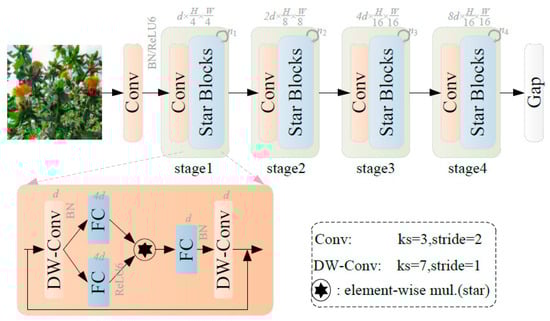 Figure 4. StarNet adheres to a traditional layered network structure, comprising four stages, with the number of channels doubling at each stage and a channel expansion factor of four. Convolutional layers are utilized for downsampling, and feature extraction is performed using Star Blocks, which incorporate deep convolution at the final stage. Batch normalization, rather than layer normalization, follows the deep convolution layer to enhance computational efficiency. The network structure iteratively employs multiple star-shaped blocks for feature extraction, eschewing complex structures or hyperparameter settings.