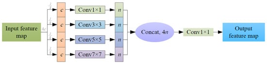 c, then processes the features with 1 × 1, 3 × 3, 5 × 5, and 7 × 7 convolutions to obtain 4 groups of features with channel number