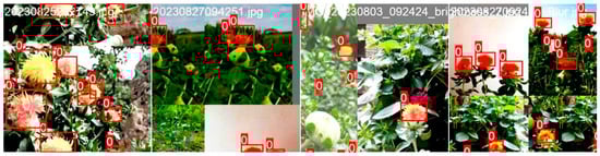 Figure 2. These augmentation methods expanded the original dataset to 6500 images, which were divided into training, validation, and test sets in a 7:2:1 ratio, ensuring no duplication to prevent model overfitting. The Labelimg tool was employed to annotate the training and validation datasets. During filament annotation, only the minimum bounding rectangle area of each filament was considered, excluding those with more than 70% occlusion, excessive blur, or those too distant to recognize. Based on safflower filament harvesting stages, the samples were labeled as Safflower-B (blooming period) and Safflower-D (decay period) and saved in XML format to provide a foundational dataset for the intelligent recognition model of safflower filaments.