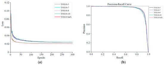 Figure 10a, it is evident that the learning rate was high in the early training stages, with the Loss curve converging rapidly. At around 250 epochs, the Loss stabilized at 0.025. Compared to other baseline models, the YOLO-SaFi model converged the fastest and had the lowest stable Loss value.