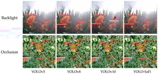 Figure 14. Compared with YOLOv8 and YOLOv10, the improved model YOLO-SaFi has the highest average recognition accuracy and the best confidence in unstructured environments, with no missed or incorrect detections. YOLOv8 missed three small safflower filaments under backlight conditions; under occlusion conditions, both YOLOv8 and YOLOv10 exhibited repeated incorrect detections of multiple detection frames for a single filament, and the confidence was relatively low.