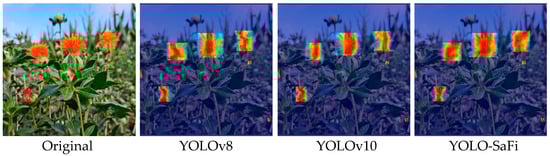 To better illustrate the detection performance of the improved Yolo-SaFi model on small safflower filament targets in unstructured environments, this study used Grad-CAM (Gradient-weighted Class Activation Mapping) [