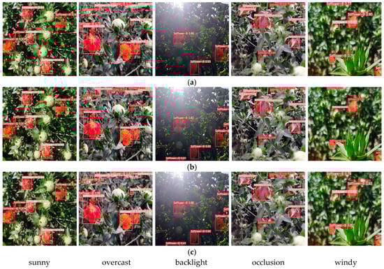 To further verify the detection performance of the improved YOLO-SaFi model on edge devices, this experiment selected safflower filaments in unstructured environments on sunny, overcast, backlight, occlusion, and windy conditions, and it conducted comparative experiments using YOLOv8, YOLOv10, and YOLO-SaFi algorithm models. The detection results are shown in