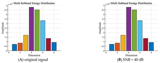 The energy features of signal sub−bands were divided into time−domain multi−sub−band energy features and FMSE features. The algorithm of time−domain multi−sub−band energy features was used to divide the signal time domain into multiple sub−bands, calculate the energy of each sub−band, and then convert this data into the frequency domain through a Fourier transform. According to the frequency−domain envelope, it was determined whether there was a prominent signal consistent with the breathing frequency of the diver, which could be used to achieve the discrimination of the diver. However, this method may cause secondary frequency interference in the actual process; when the signal−to−noise ratio (SNR) was low, this method could not effectively highlight the breathing cycle of the diver’s signal [18]. The FMSE algorithm was first used to convert the time−domain signal into a frequency−domain signal, and then perform band−pass filtering and sub−band division to calculate the energy of each sub−band signal. During the calculation process, FMSE can effectively improve the SNR without secondary frequency interference.