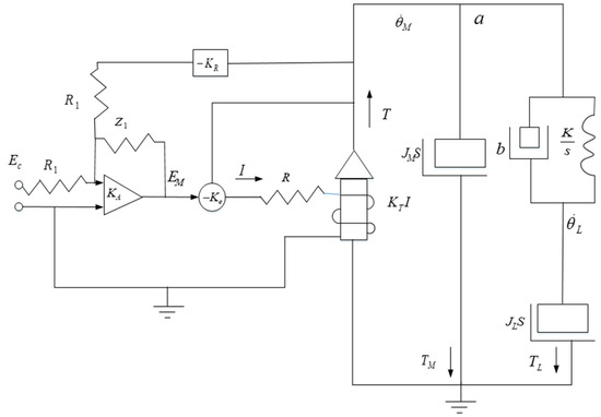 For the convenience of further research on the controlled object. Simplify the structure of its control system to the one shown in Figure 4. Among them, is the motor side moment of inertia, is the load side moment of inertia, is the motor speed, and T is the motor side output torque. The elastic impedance of the controlled object structure is composed of the viscous damper coefficient b and the stiffness coefficient K. represents a measurement device such as a gyroscope, represents an amplifier, and represents the torque constant of the motor.