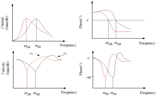 The current response reaches its maximum value at and is consistent with the phase of . In addition, the speed of the motor will rapidly decrease at point , and the phase difference with is 180°. Within the limited range of , when the speed amplitude of the motor is the smallest, the amplitude of the current response is the maximum value. In this scenario, despite the presence of an anti-resonance point, the phase difference between the resonance and anti-resonance points exerts only a modest constraint on the amplitude of the resonance point. In conclusion, the presence of the resonant peak factor F significantly affects the performance of the control system.