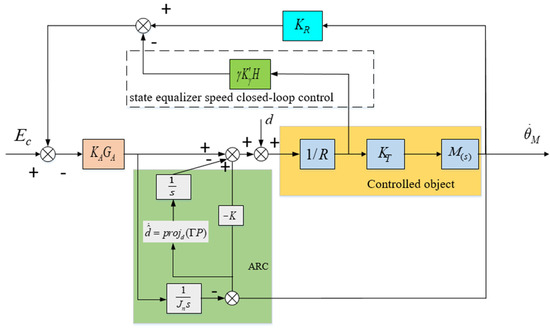 According to the resonant balancing speed closed-loop circuit in Figure 10, in order to ensure the stability of the current loop, the coefficient of the state equalizer in Equation (24) cannot be greater than 1. Therefore, the value of needs to be adjusted between 0 and 1 based on the magnitude of high-frequency disturbance. When , the resonance peak factor F in Equation (24) is cancelled out, and thus the mechanical resonance frequency is also eliminated. At this point, the closed-loop bandwidth of the system is mainly determined by amplifier system , which can eliminate the impact of high-frequency disturbances caused by mechanical resonance on the control system. The control structure after combining the adaptive robust control method with the state equalizer is shown in Figure 12. After combining the two methods, the state equalizer algorithm can increase the bandwidth of the closed-loop system, which can further increase the gain value, thereby improving the anti-interference effect and robustness of the control system, and ultimately achieving the goal of improving the visual axis stability accuracy of the aviation optoelectronic stability platform.