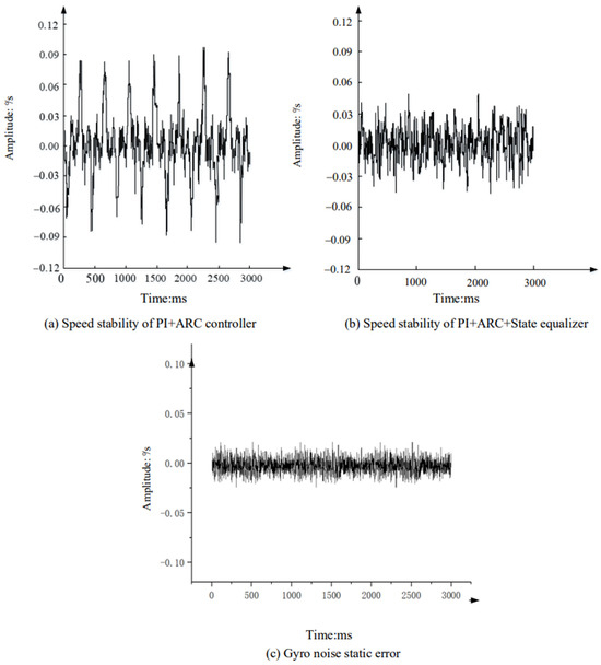 From Figure 16 analysis, it can be seen that compared with the PI + ARC controller, the platform speed is stable and significantly improved after adding a state equalizer speed closed-loop, with a peak value of approximately 0.04°/s. Considering the high noise level of the gyroscope, the peak noise level of the gyroscope is 0.02 when the platform is absolutely stationary. This indicates that in such a noisy system, the improvement limit of this system is 0.02, indicating that the disturbance suppression results of the optoelectronic stable platform with the PI + ARC control algorithm incorporating state equalizer speed closed-loop are very satisfactory.