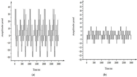 As shown in Figure 21a, the shaking range of the optoelectronic platform’s visual axis when using the PI + ARC control algorithm under vibration condition 3 g/Hz2 is represented by 38.11627 µrad. Figure 21b shows the visual axis shaking range of the optoelectronic platform using the PI + ARC + State equalizer control method under the same vibration conditions, which is only 1/3 of the PI + ARC algorithm.