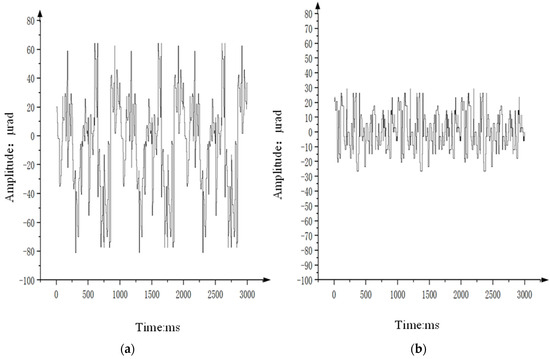 Using a vibration level of 3 g/Hz2 on the vibration table as an example, the aviation optoelectronic stabilization platform is fixed on the vibration table. The off-target information obtained under visible light load tracking is used to analyze the stability accuracy of the equipment’s visual axis. Figure 21 shows the off-target data information in the azimuth direction of the aviation optoelectronic stabilization platform when using PI + ARC controller and PI + ARC + State equalizer controller, respectively.