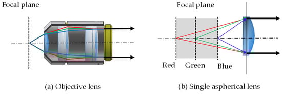(a) Ray tracing of the objective lens. Even if the wavelength of the lighting used varies, the light is focused on a single focal plane. (b) Ray tracing of a single aspherical lens. Focal planes at different positions are formed depending on the wavelength of the lighting used.