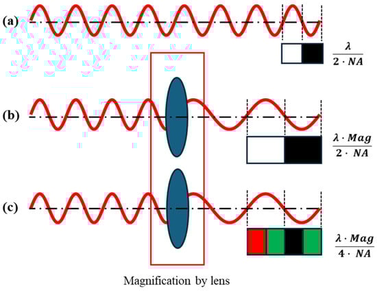 According to the Nyquist theorem, the pixel size must be smaller than λ/(2∙NA). Here, λ is the wavelength of the optical field, and NA is the NA of the objective lens. Pixel sizes larger than the Nyquist limit can lead to pixel aliasing problems in the Fourier domain; therefore, the pixel size of the camera used in FPM should be carefully selected to meet the Nyquist limit. The pixel size, considering the Nyquist criteria, was selected as shown in Figure 3 [16].