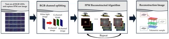 Figure 4 presents the simultaneous multifocal plane FPM workflow. All RGB LEDs are turned on to illuminate the sample so that a raw image with chromatic aberration is obtained, as shown in the leftmost picture in the bottom row of Figure 4. Afterward, the R, G, and B channels are separated from the raw image, and images with low resolution are separated at the point where the focal plane is formed for each wavelength. By performing the FPM reconstruction algorithm based on the image array for the focal plane of each wavelength, it is finally possible to reconstruct a high-resolution image at three focal planes for each wavelength simultaneously. The FPM reconstruction algorithm is based on the principle that illuminating an object with tilted plane waves is equivalent to shifting the Fourier spectrum in the Fourier plane by the corresponding tilt angle [17]. The image array obtained with plane waves tilted at different angles is shifted in the Fourier plane according to each angle and then combined. By repeating this process multiple times, a high-resolution reconstructed image can be obtained.
