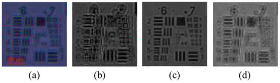 Figure 5a is an image obtained from the color camera with all RGB LEDs turned on. To accurately analyze the resolution of the captured image, the 1951 USAF resolution chart was placed at the focus point of the objective lens, and the image was captured. The 1951 USAF resolution chart was located at the focal point corresponding to a wavelength of 520 nm. Figure 5b–d shows the R, G, and B channels, respectively. Except for the image of the G channel where the focal plane is located, the R channel and B channel image qualities are deteriorated due to defocusing by chromatic aberrations [18].