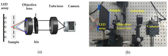 Fourier ptychographic microscopy (FPM) is an imaging technology that overcomes the limitations arising from the space–bandwidth product of conventional microscopy, enabling a wide field of view (FOV) at high resolution [1,2,3,4]. FPM can easily acquire high-resolution images by reconstructing several images obtained using light sources that illuminate the sample at various angles in the Fourier plane. Consequently, due to its wide FOV and high resolution, FPM is widely applied in various fields, such as biomedical research [5,6] and industrial instrumentation [7].