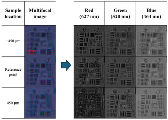 Figure 7 shows captured images with all the RGB LEDs located in the center turned on and the USAF 1951 target positioned at the focal plane corresponding to each wavelength. At the focal distance of the central wavelength of the LED array, 520 nm, there is a difference of −450 μm observed for the focal distance formed by light at 627 nm, while the focal distance formed by light at 464 nm is confirmed to be positioned at +450 μm.