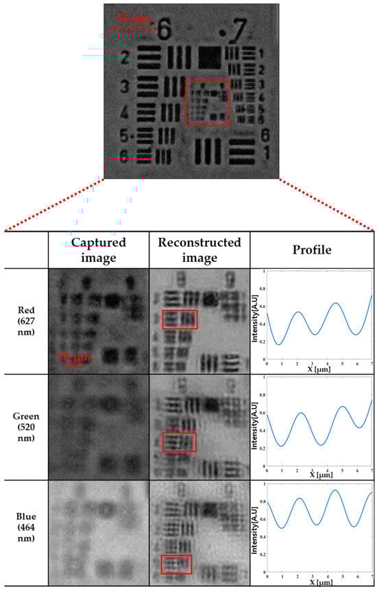 Figure 8 shows the reconstructed image of the R, G, and B channel image, 8 Group 3 element profile of the red reconstructed image, 8 Group 4 element profile of the green reconstructed image, and 8 Group 5 element profile of the blue reconstructed image. To evaluate the resolution of the FPM image, we calculated the contrast ratio using the image profile of the resolution chart. The contrast ratio is calculated as follows: contrast ratio = (Imax − Imin)/(Imax + Imin), where Imax and Imin are the maximum and minimum intensities of the image, respectively. Generally, in optical systems, if the contrast ratio is over 0.2, the spatial resolution is deemed acceptable. The resolution calculated at the 627 nm wavelength used in the R channel image and with a synthetic NA of FPM of 0.23 is 1.66 μm using the following formula: resolution = 0.61∙λ/NA. The measured contrast ratio of group 8 element 3 with a bar/space width of 1.55 μm is 0.32, as shown in Figure 8 reconstructed image of red, which can be determined to meet the contrast ratio criteria. The G-channel image has a resolution of 1.37 μm, which corresponds to element 4 of Group 8 of the USAF Resolution Test Chart. The measured contrast ratio of group 8 element 4 is 0.22, as shown in Figure 8 reconstructed image of green, which meets the contrast ratio criteria. The resolution of the B channel image is 1.23 μm, which roughly corresponds to element 5 of group 8 in the test chart. The measured contrast ratio of element 5 of group 8 is 0.25, as shown in Figure 8 reconstructed image of blue, which meets the contrast ratio criteria, confirming that the measured resolution is similar to the calculated value.
