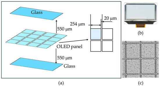 Transparent OLED used for evaluating the multifocal imaging performance. (a) Schematic structure of OLED. The OLED panel is protected by a glass substrate with a thickness of 550 μm above and below. The size of the OELD pixel is 254 μm, and the spacing between each OLED pixel is 20 μm. (b) Photo of the transparent graphical OLED. (c) The transparent OLED magnified and imaged with an objective lens with an NA of 0.13 and magnification of 4.