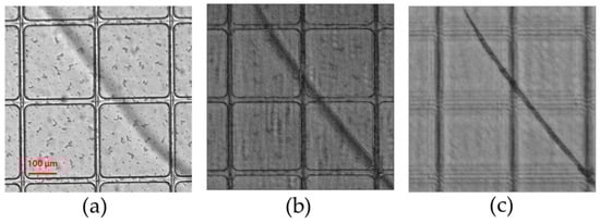 Figure 10a shows the OLED pixel layer in focus using an objective lens with an NA of 0.13. It is possible to observe one OLED pixel using conventional microscopy, but the scratches expected on the upper and lower glass substrate surfaces cannot be accurately imaged due to the limited DOF. Additionally, a separate focal length adjustment is required to determine which particular glass substrate is scratched. Figure 10b image is an image taken by focusing on one transparent OLED pixel using simultaneous multifocal plane FPM. After the FPM separation and reconstruction algorithms are performed, the OLED pixel is focused only on the R channel image. In addition, the G channel image reveals the scratches on the glass substrate, as shown in Figure 10c. Because the wavelength of the optical field used in the G channel image is longer than the wavelength used in the R channel image, the focal distance of the G channel is shorter, and it can resolve the scratches on the top glass substrate without requiring the sample to be moved along the z-axis.